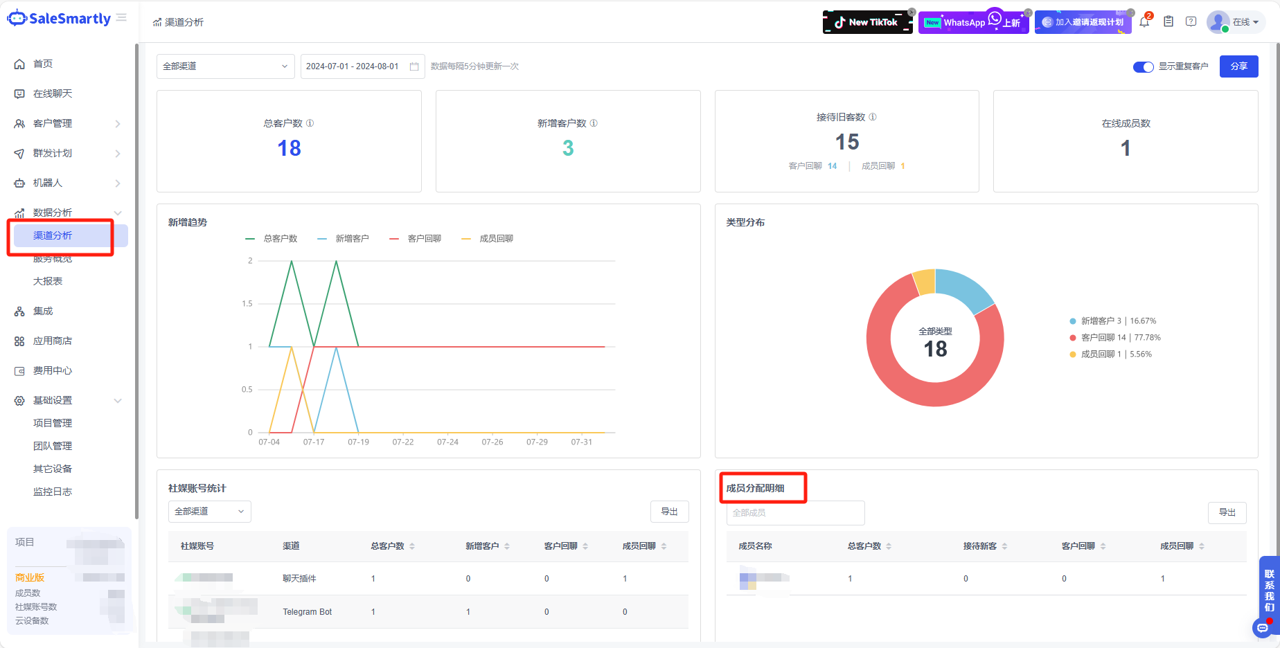 5.管理者如果想要查看每个成员的服务状况的话,可以在【渠道分析】中找到每个成员的分配明细,清晰展现成员的接待的客户数。