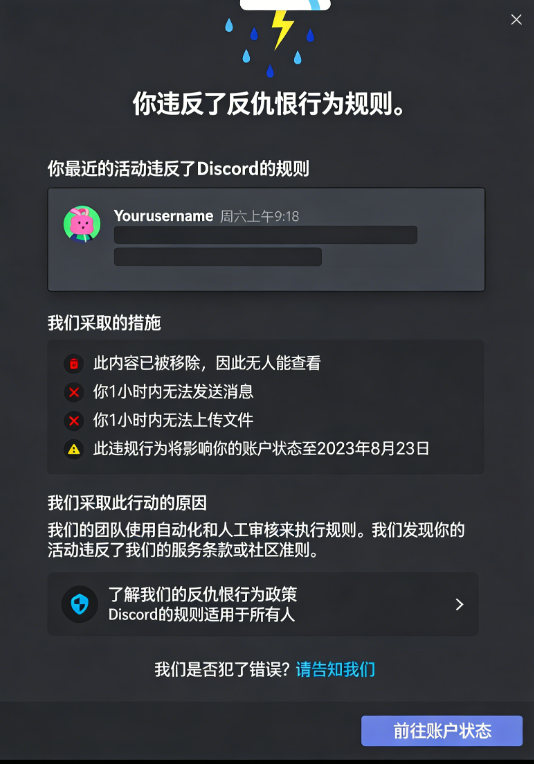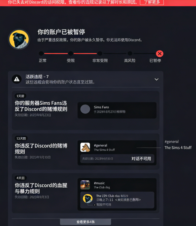 发布色情、暴力、仇恨言论、诈骗信息等违反Discord社区准则的内容,账号会被直接封禁。这是最不可逆的封禁类型。