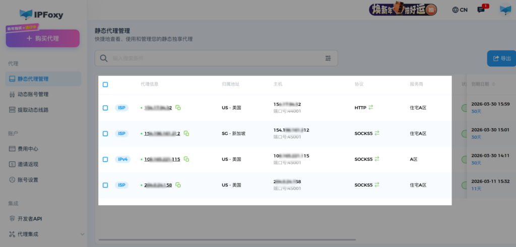 获取配置方式:IPFoxy静态住宅代理 - 选择静态住宅ISP住宅- 获取线路端口、主机、协议、账密信息-配置指纹浏览器/Chorme浏览器/云手机设备。