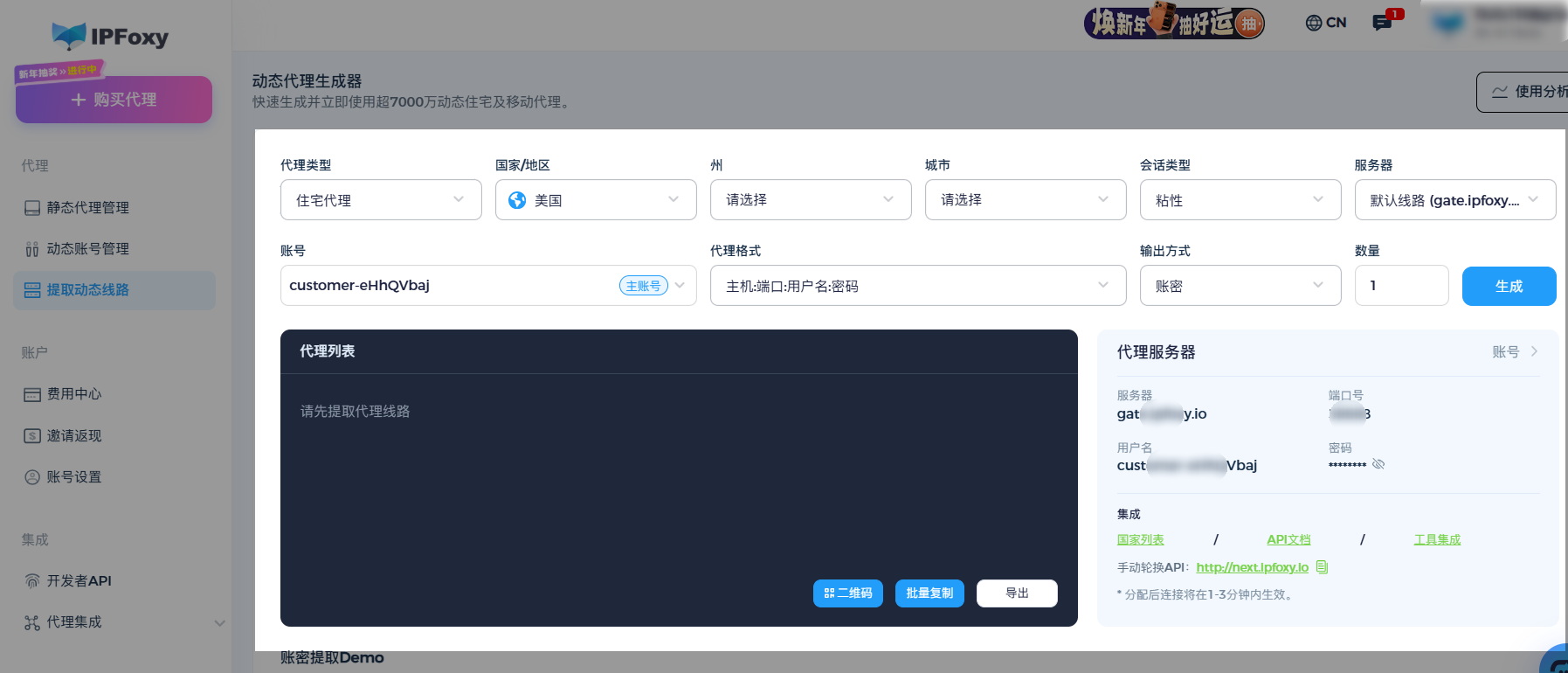 配置动态代理国家/地区/州/城市、轮换间隔、粘性时长参数、线路等参数,可以通过IPFoxy动态线路提取后台一一配置并集成到脚本中。