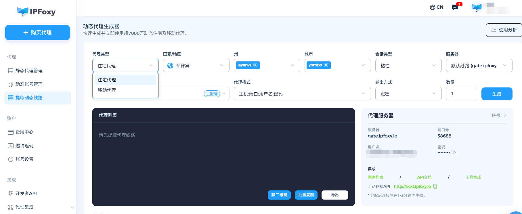在实际部署中,越来越多团队会通过住宅 IP / ISP 代理网络(如 IPFoxy住宅IP服务)来优化 API调用环境,降低封禁与限流风险。这类服务提供真实家庭 IP 池,支持按地区筛选(美国、欧洲、日本等),并且可以做到 IP 轮换和粘性会话,兼顾稳定性和分散性。