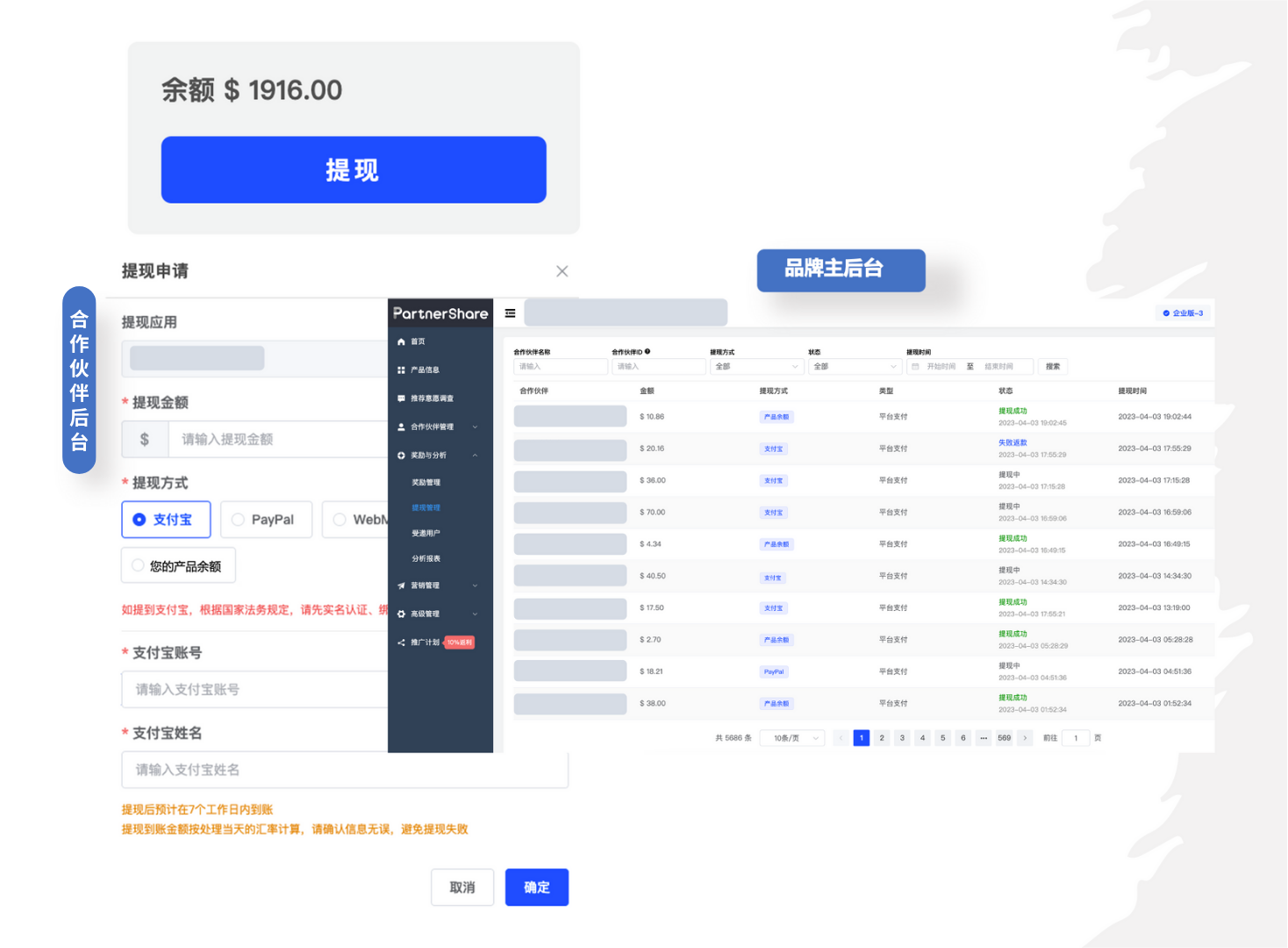 佣金支付方式应该灵活多样,以适应不同合作伙伴的需求。常见的支付方式包括支付宝、PayPal,这两种PartnerShare联盟系统都支持,也支持人民币、美元两种主流货币结算,合作伙伴可以随时随地申请提现。另外,产品方也可以订阅PartnerShare的“多钱包”增值服务,开通之后产品方可以为合作伙伴发放人民币、美元两种奖励,合作伙伴也可以灵活地选择两种币种奖励。
