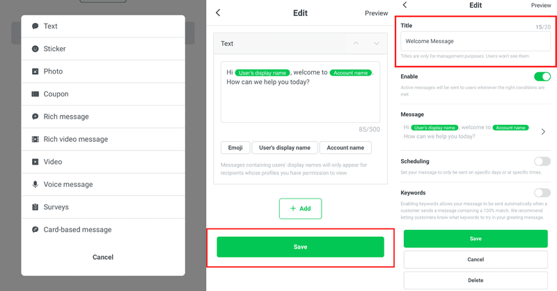 3.选择你想要设置的信息类型,LINE 自动回复涵盖多种信息类型:文本、贴纸、照片、优惠券、富文本、富视频消息、视频、语音、问卷和卡片信息。