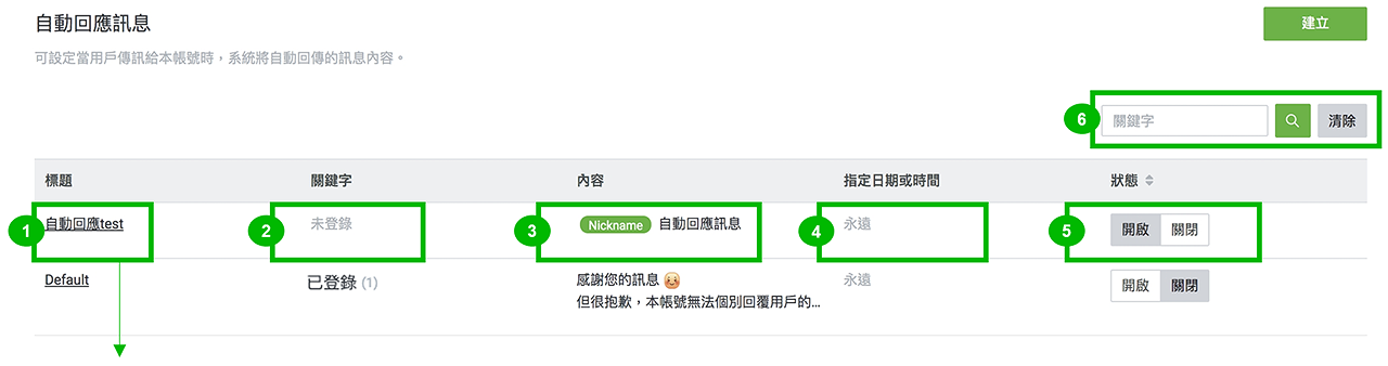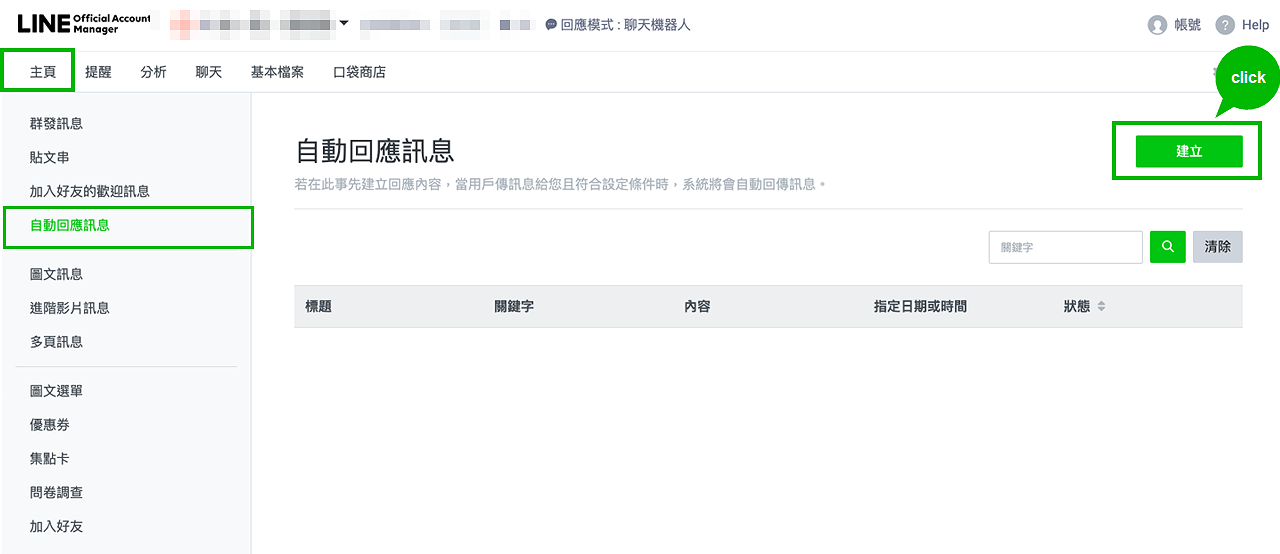 3.在主页点击“自动回应消息”,然后点击创建就可以新增自动回复消息。