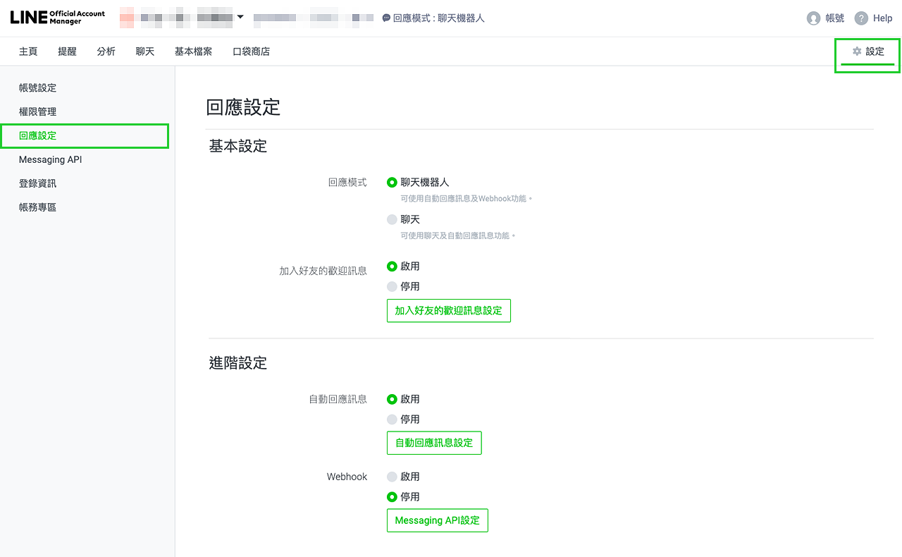 2.点击账号右上角的“设置”,然后在左侧选择“回复设置”进入设置页面。