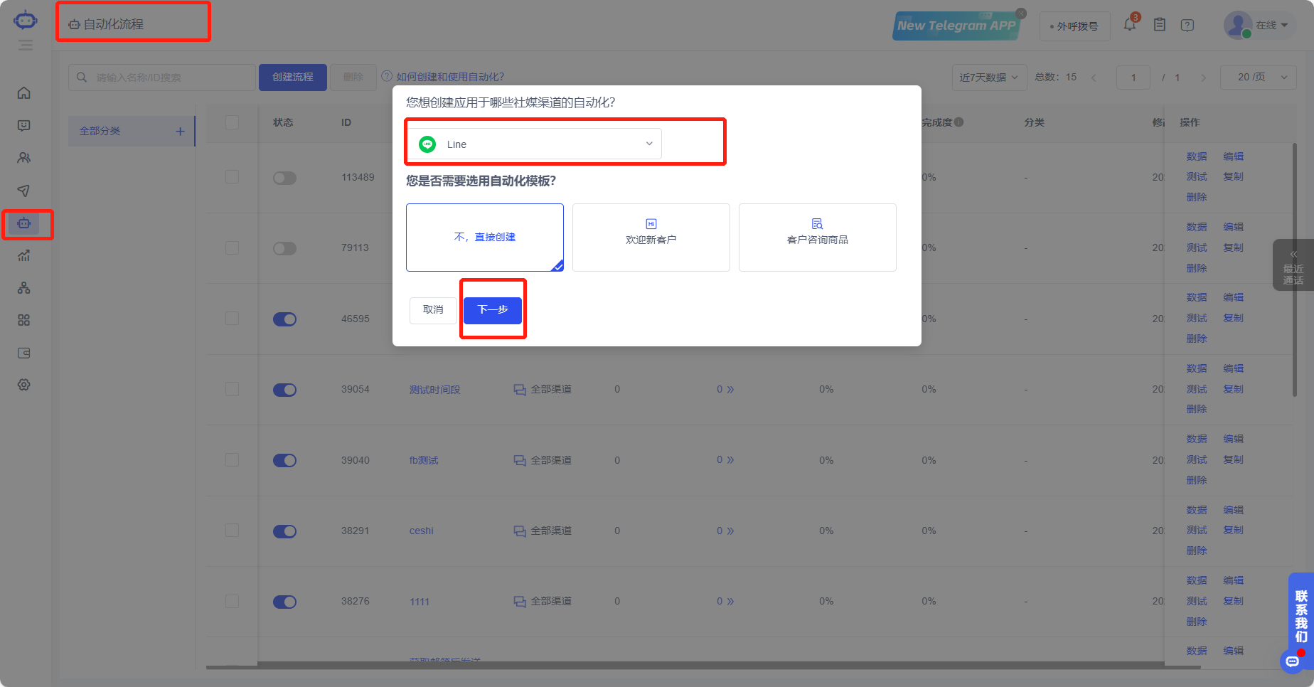 1.点击“自动化流程”,选择LINE渠道,可以自行选择是否需要模板,然后点击下一步。