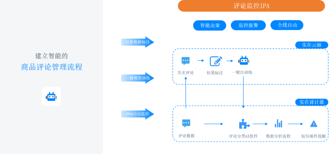 以实在智能在服务的某电商品牌为例,他们在评论管理场景使用云脑平台:基于企业已有的大量评论数据,实在云脑能一键训练深度学习模型,监控商品评论走向,再结合RPA实现智能监控商品质量和智能提醒。