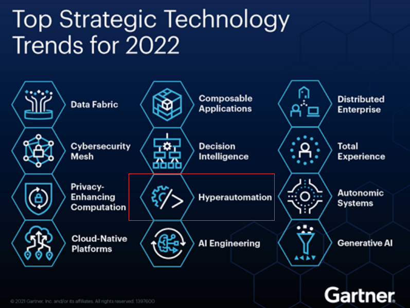 近日,Gartner发布了《2022年12大技术趋势》报告,其中,超自动化已连续3年入选技术趋势报告,成为入选次数最多技术之一。超自动化的核心,就是将RPA与AI深入融合,同时融入低代码、流程挖掘等技术,实现智能决策和数字化运营。Gartner预测,到2024年,超自动化技术有望将企业的运营成本降低30%。
