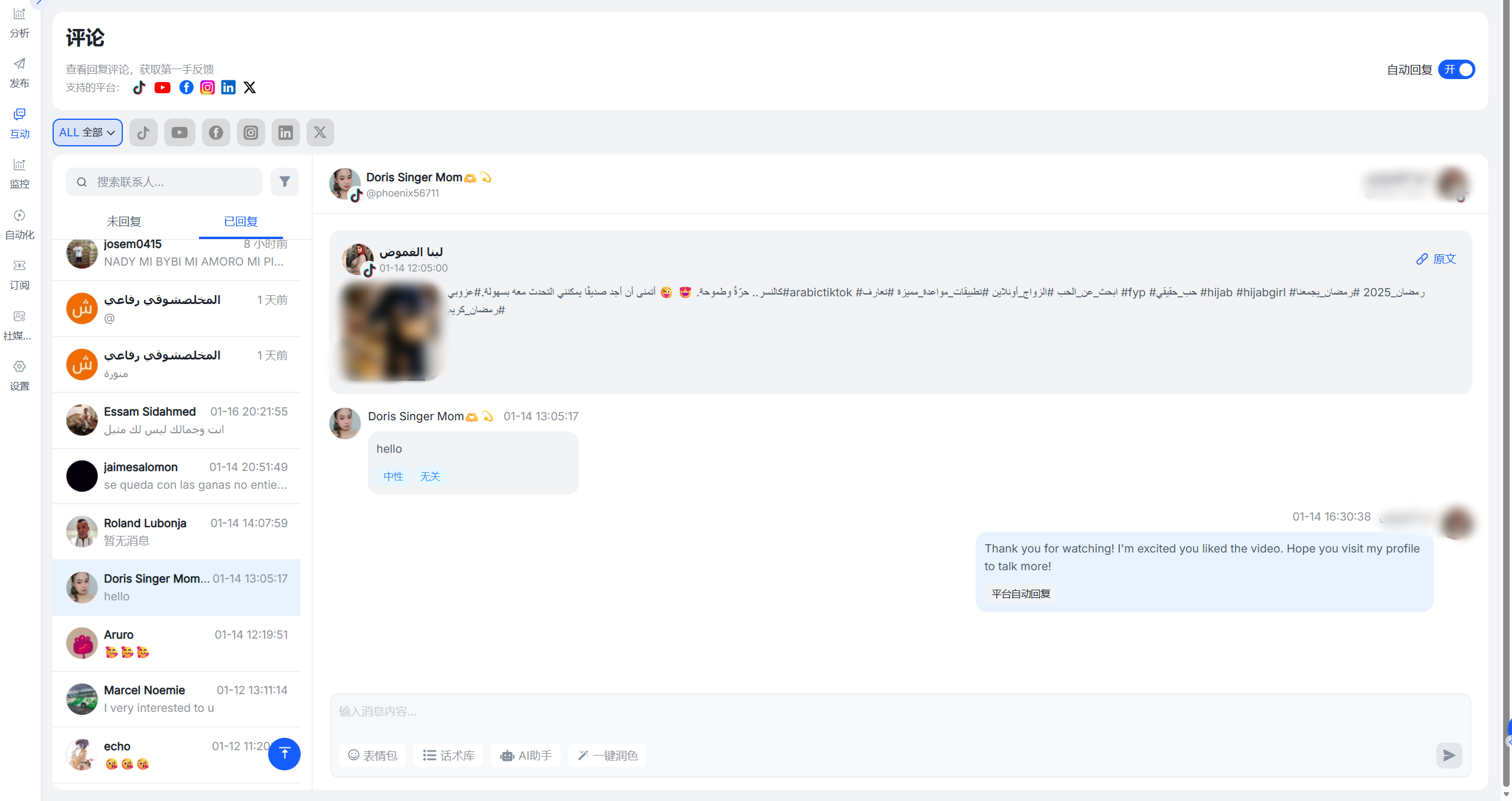 利用工具的统一收件箱功能,将所有平台的评论、私信、@提及等信息聚合到一个界面。运营者只需在一个地方,就能处理所有互动,无需再登录 7 个后台。