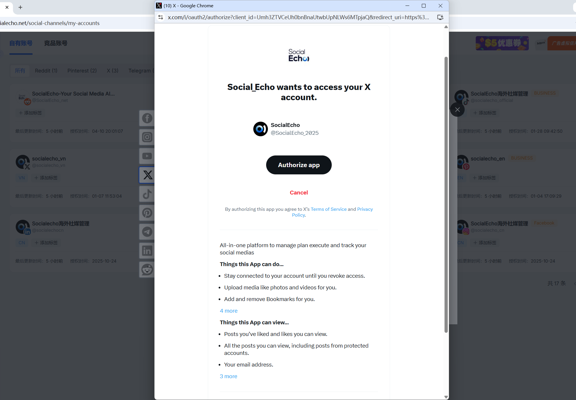 (SocialEcho通过X平台提供的授权机制完成授权)