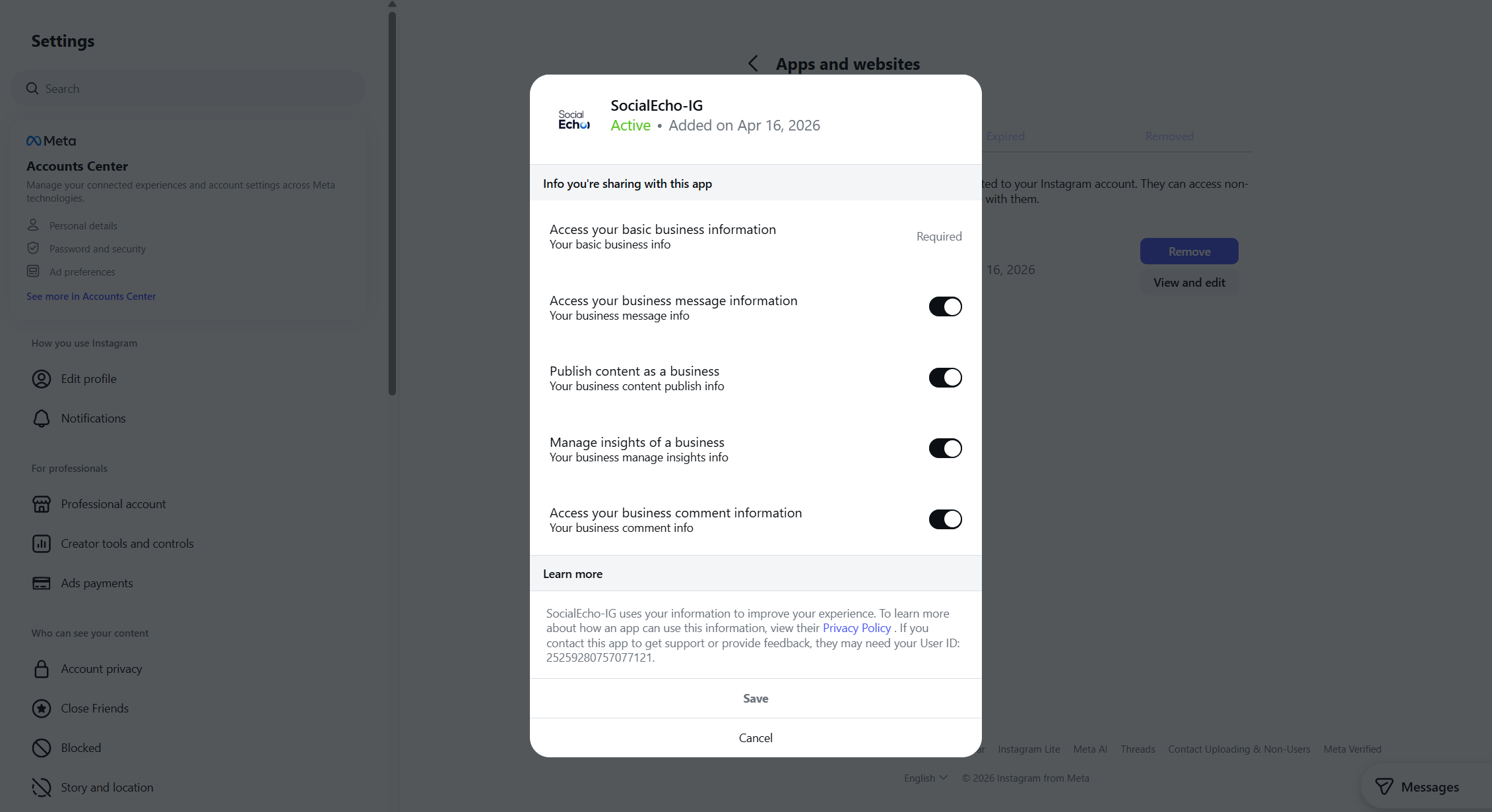 (IG平台明确规定SocialEcho的操作权限)
