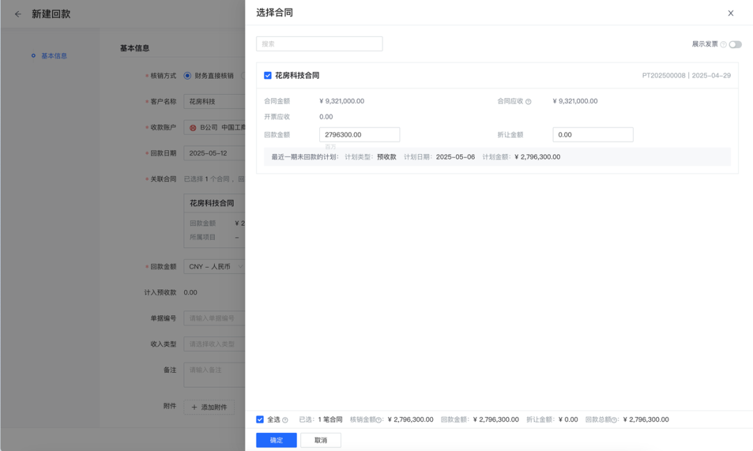 收到客户付款后,在系统中录入回款信息,系统会自动将回款信息与相应的回款计划进行关联,并进行核销操作,确保回款数据的准确性和完整性。同时,客户回款进度视图一目了然,便于追踪管理。