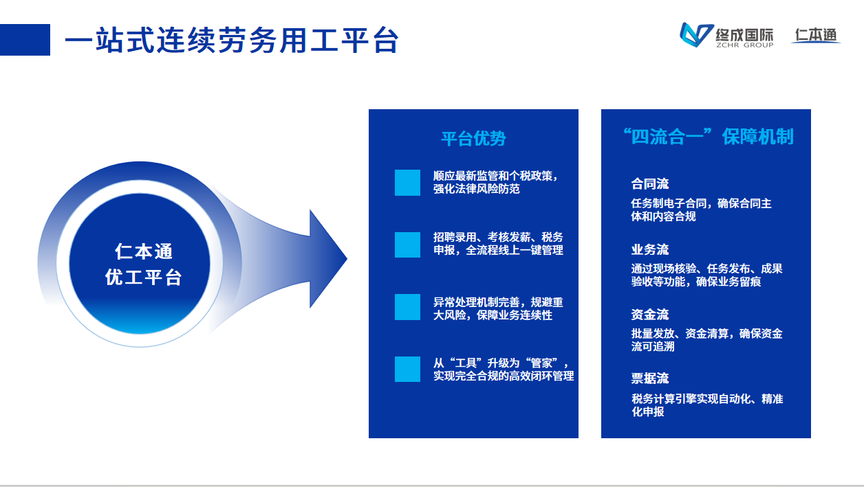 1、全面的劳动关系管理:提供从员工入职、在职到离职的全流程劳动关系管理服务,包括劳动合同签订、档案管理、员工关系协调等。通过服务外包模式,由终成国际与员工建立劳动关系,帮助企业全方位规避传统用工模式下的法律风险。 2、全国社保与公积金服务:这是解决企业异地管理难题的核心服务。终成国际依托覆盖全国200多个城市的服务网络,为企业提供全国范围内的社保、公积金账户开设、缴纳、转移、理赔申报等一站式服务。企业无需在各地设立分支机构或配备专人,即可实现“一点对接,全国覆盖”。 3、薪酬核算与代发:提供专业、合规的薪酬核算、个税计算与申报、工资代发服务。通过其数字化平台,可以自动集成考勤数据,实现薪酬的自动化、精准化核算,大幅提升效率并避免人工误差。 4、人事事务性工作支持:涵盖员工背景调查、入离职手续办理、证明开具、政策咨询等日常人事行政工作,将企业HR从繁琐重复的事务中解放出来。 5、风险防控与纠纷处理:拥有专业的法务团队,提供劳动法律法规咨询、合规审查,并在发生劳资纠纷时代表企业进行协调与处理,维护企业声誉与稳定。