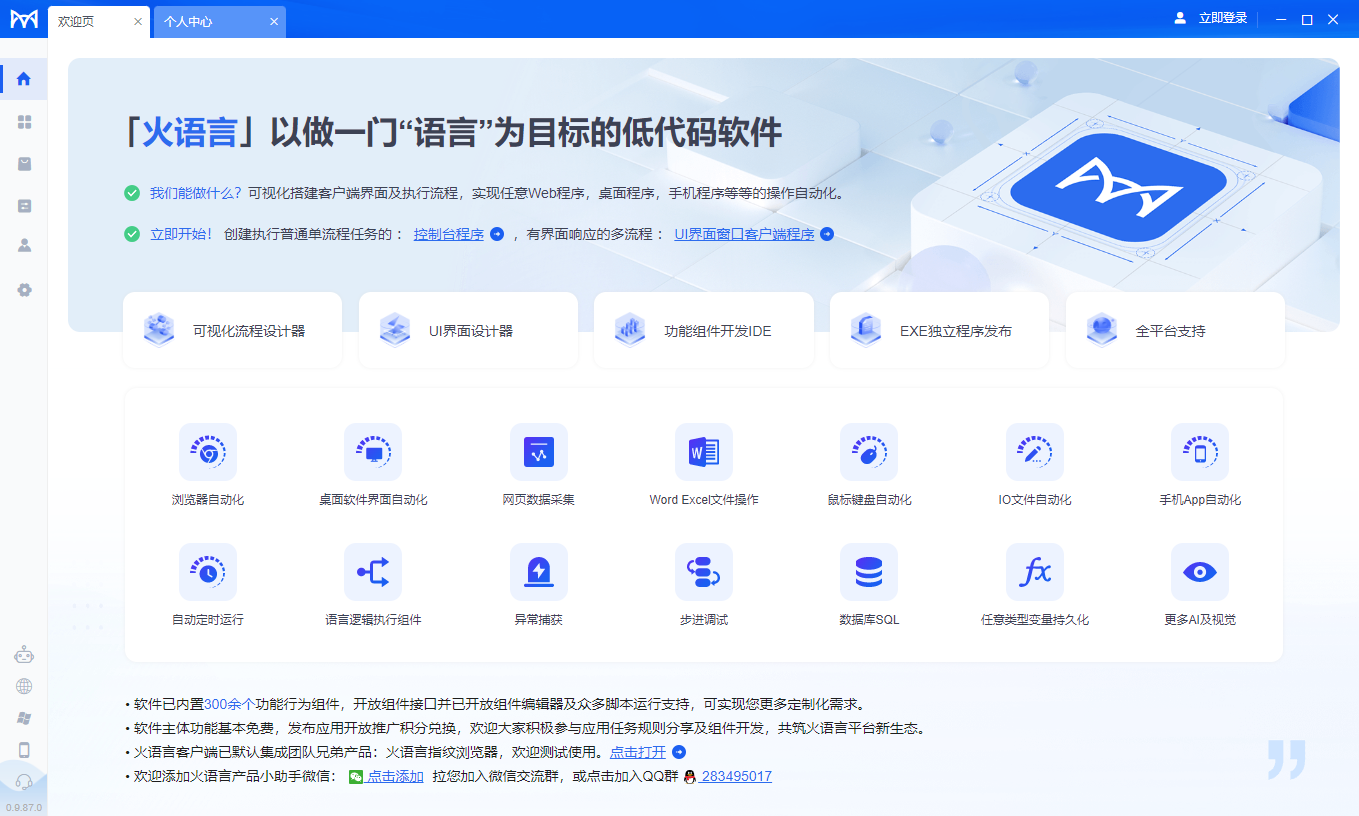 火语言是一款面向低代码开发的增强型RPA(Robotic Process Automation,流程自动化机器人)工具,致力于帮助用户快速实现从创意到应用的转化。无需深入的编程知识,即可轻松开发控制台程序或带界面交互的客户端应用,让软件开发变得更直观、更高效。